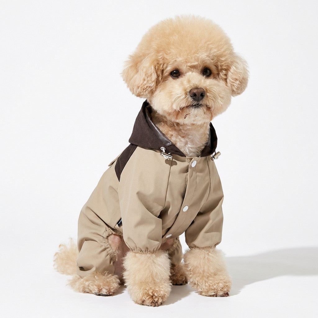 מעיל גשם יוקרתי, בד עמיד ואיכותי שמגן על הכלב תוך שמירה על סגנון. פריט אלגנטי ומעוצב שמוסיף נוכחות בכל מזג אוויר.